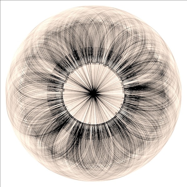 Again, not very useful, but strangely beautiful. This is more of a concept study for the visualization of hierarchical graphs where there is a lot of branching at the lower levels. Circular visualization has the natural advantage that the outer circles provide more and more space for nodes. Edge crossing minimization will help to untangle the connecting lines and produce clearer graphs. Of course, an interactive versions can be very useful by providing means to rotate circles, highlight nodes and their connections and switch between different bar chart data sources.