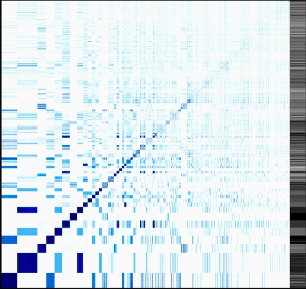 Classic heatmap visualization of the enzyme reaction mechanism clustering project I am working on (see Science things#Enzyme clustering for details). This visualizes a distance matrix of all the tested enzymes. So, on the x axis, each column is an enzyme, and on the y axis each row. Each line corresponds to a comparison of the enzyme in that line with all the other enzymes. The diagonal of this square compares the enzyme with itself. The more similar two enzymes are, the darker the dot.