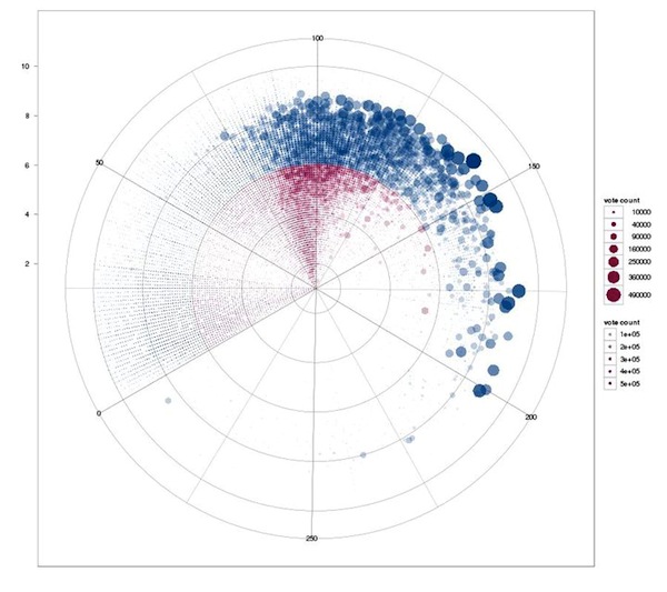 Nice umbrella shape. The few shorts with more than 1000 votes are well rated. Again, nobody rates bad shorts, it seems. Longer movies tend to get better ratings, and there is a slight correlation of runtime and ratings (when moving out to better ratings, the line shifts clockwise to longer movies).