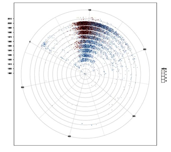 Correlation of movie runtimes and IMDb rating over the decades. Blue dots for movies with ratings above the global median (6.48 of 10), red dots for ratings below with increasing alpha values in both directions. Decades are shown in concentric circles with the 2000s in the outer circle. This is quite handy, since the number of movies increased almost exponentially and outer circles have more space to spread out.