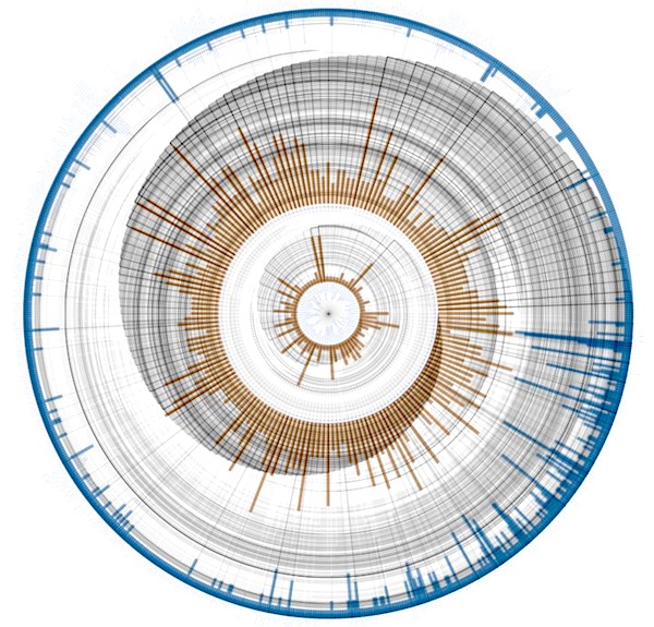 The KEGG Module database (https://www.genome.jp/kegg/module.html) consists of functional subunits of metabolic pathways. They might be shared and reused in different pathways and describe a particular metabolic activity or pattern. This graph relates pathways (nodes arranged on the innermost circle) to modules (middle circle) to enzymes (outer circle), which form a hierarchy: An enzyme can take part in different modules, which might be part of different pathways. Lines between the circles represent this relationship. The lines are drawn outwards, go clockwise around the circle and then outwards to the connected node. Radius lengths based on the positions of the connected nodes produce the spiral shape. The bars for each node show the out- (blue) and in-degree (orange), i.e. the number of modules this pathway is made out of, the number of enzymes making up that module and the number of modules an enzyme takes part in.