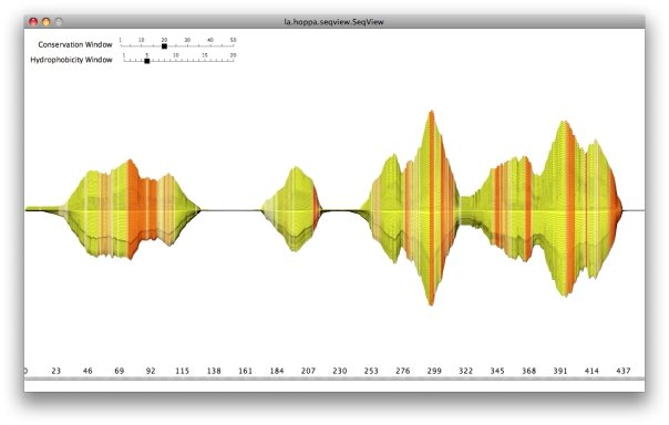 Old project: Visualizing multiple sequence alignments (MSA) of protein sequences, frequently used in homology research. Each sequence of the alignment is a horizontal line. Based on conservation at each position of the sequences (bit-score), the line deviates along the y-axis. So regions with high similarity are wider than others (conserved regions like protein domains). Various amino acid properties can be used to color the alignment, in this picture it is hydrophobicity. This shows transmembrane domains quite nicely in uniformely orange regions, for example. All values are calculated as moving averages to smooth things. The window size can be configured interactively.
